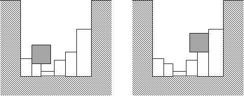 图1 现在,我们要在这个坑中再放入一块正方形积木,但我们希望这块积木的位置最低。如下图所示,左图中的灰色积木的位置就比右图中灰色积木的位置更好(本题不考虑重力因素,假定新放入的积木不会倾倒,它的边永远平行于坑壁)。而且,可以看出,左图中灰色方块的位置是所有可能的位置中最低的位置(本题中,假定坑足够宽也足够深,后加的那块积木不会放不进去)。