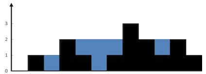 上面是由数组 [0,1,0,2,1,0,1,3,2,1,2,1] 表示的直方图,在这种情况下,可以接 6 个单位的水(蓝色部分表示水)。
