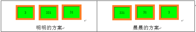 计时器游戏结束后,晨晨的同学明明取了其中的K个计时器设计出拼数字游戏:明明和晨晨各自把K个计时器排成一行,看谁拼出的数最大。例如:有K=3个计时器,上面数字分别是31,3,331,两人拼的方案分别是: