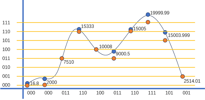 量化位数为 $3$,所以分为了 $2^3=8$ 段,每段间隔 $(20000-16)/8=2498$。找到对应的刻度。
