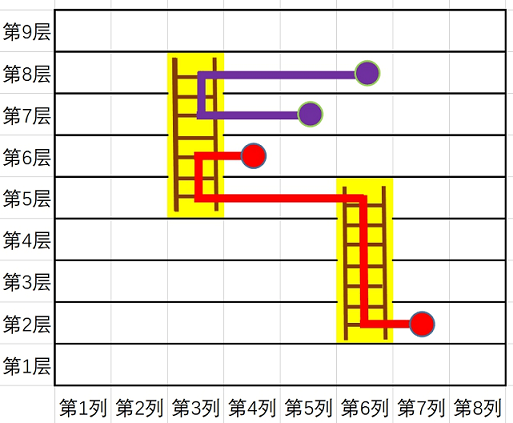 让我们把教学楼抽象成一个有H×M个格子的矩形,学生可以从一个单元格上花费1秒移动到上下左右的相邻单元格上。学生在水平方向上的移动是没有限制的(除了不能摔出楼外),但只有在有楼梯相连的时候才能进行竖直移动。一个楼梯会连接同一列中的一段连续楼层,且一列中只会有一个楼梯。对于这一部分叙述可以通过样例理解。